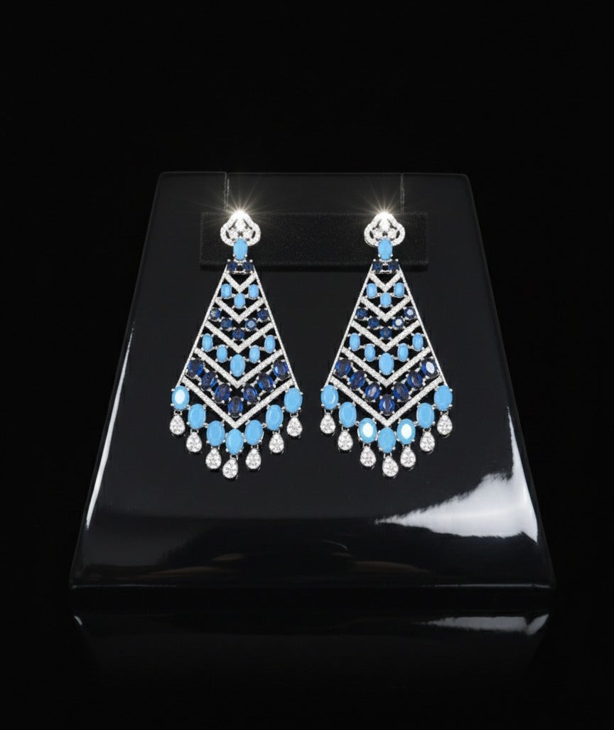This jewelry set is a stunning exercise in contrast, blending the earthy vibrance of turquoise with the deep sophistication of sapphires and the brilliance of diamonds. The design language is decidedly Art Deco-inspired, utilizing geometric silhouettes and architectural layering.